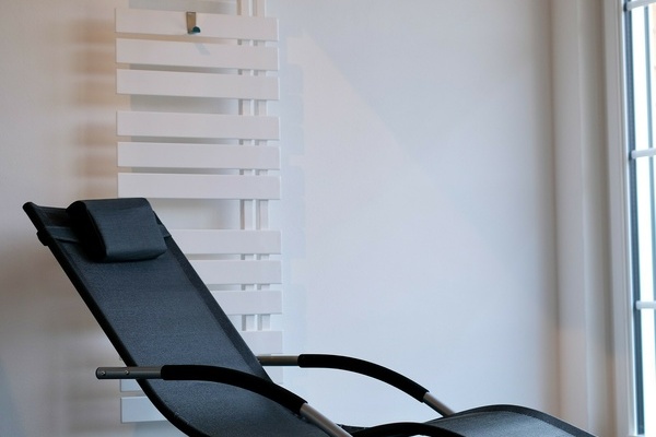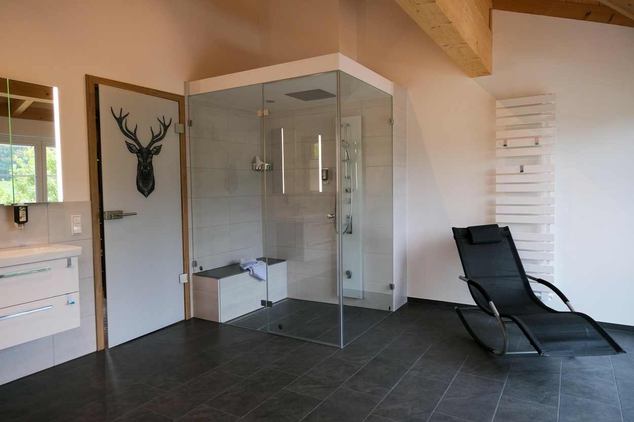 Das Luxusbad mit Badewanne, Dampf Aroma Duschsauna für zwei Personen, Ruheliegen und Panoramablick runden den luxuriösen Komfort ab, den unser Chalet zu bieten hat.