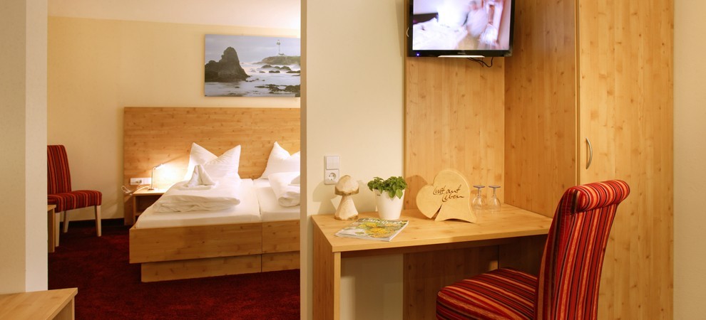 Die modernen Hotelzimmer sind im regionalen Stil gehalten. Wählen Sie zwischen Einzel-, Doppel- oder Herbergszimmer. Nur in den Herbergszimmern sind Hunde auf Anfrage erlaubt.